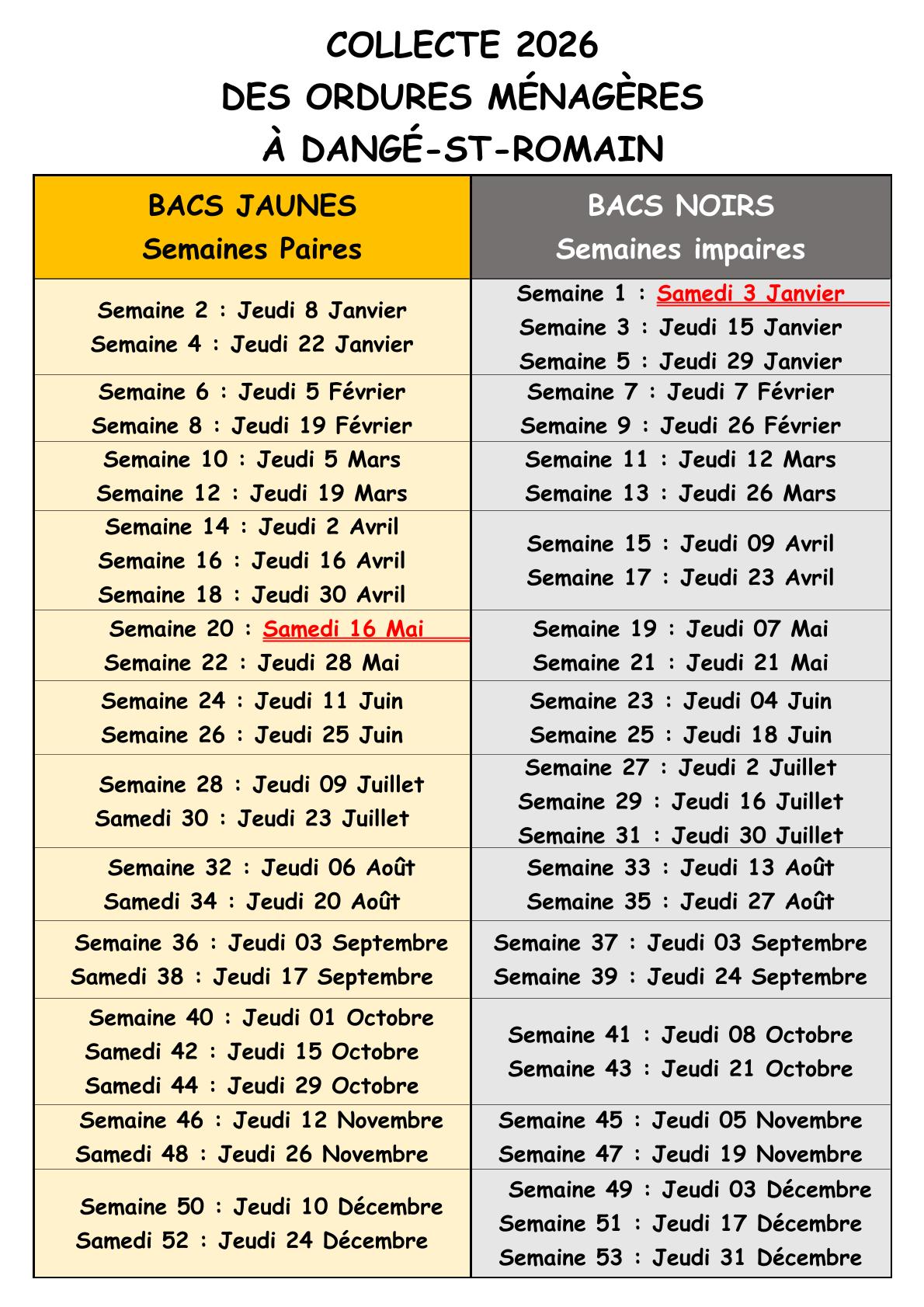 TABLEAU DE COLLECTE 2026 DES ORDURES MENAGÈRES