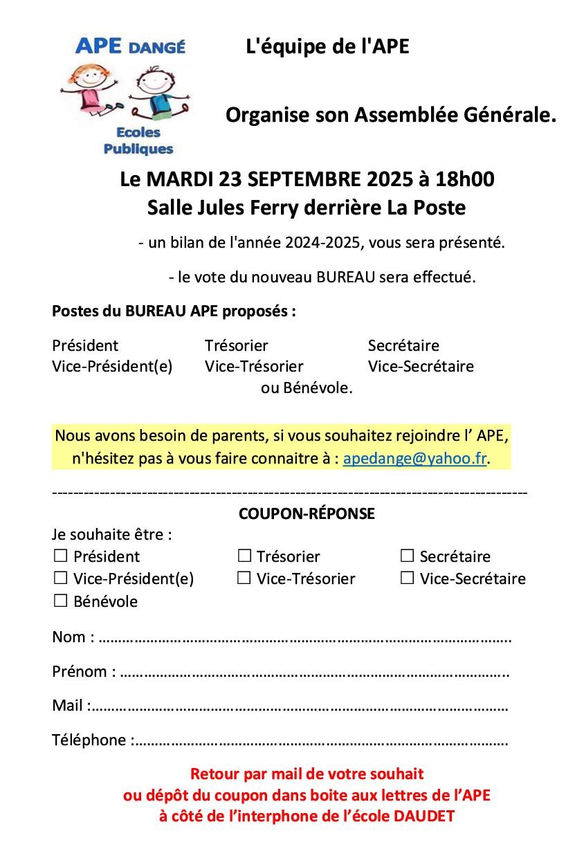 Calendrier Quand : 23 septembre 2025 @ 18 h 00 min – 21 h 00 min 2025-09-23T18:00:00+02:00 2025-09-23T21:00:00+02:00 Où : SALLE JULES FERRY 6 Rue Jules Ferry 86220 Dangé-Saint-Romain France Contact : APE SOUCHÉ - DAUDET - PERGAUD Courriel