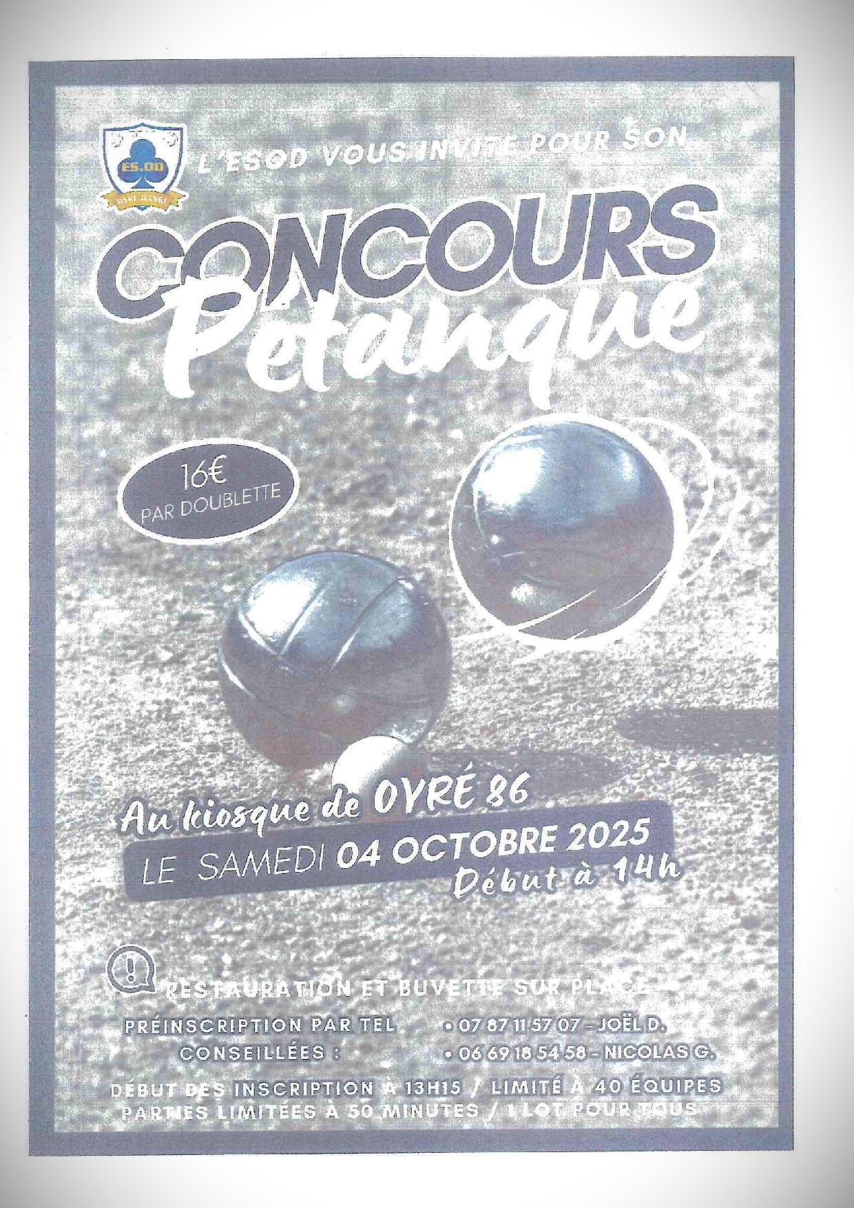Calendrier Quand : 4 octobre 2025 @ 14 h 00 min – 19 h 00 min 2025-10-04T14:00:00+02:00 2025-10-04T19:00:00+02:00 Où : KIOSQUE 86220 Oyré France L’ESOD FOOT organise un Concours de pétanque en doublettes le 04 OCTOBRE 2025 au kiosque à Oyré Limité à 40 équipes Début des Jeux à 14h Inscriptions au près de : Joël DECHAUME au 07.87.11.57.07 Nicolas GUILLEMOTO au 06.69.18.54.58