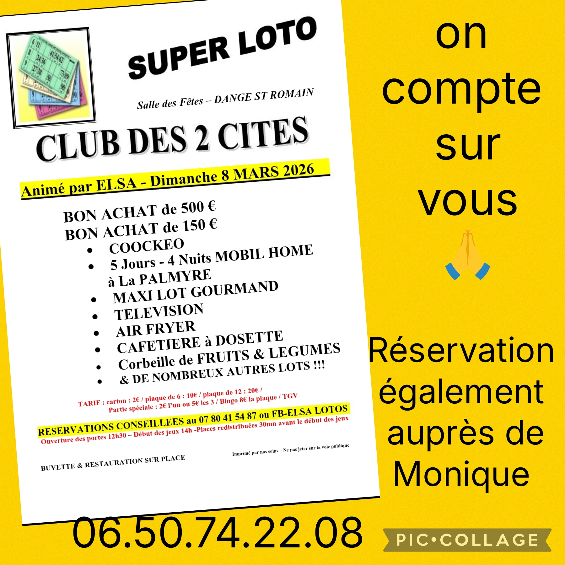 Calendrier Quand : 8 mars 2026 @ 14 h 00 min – 20 h 00 min 2026-03-08T14:00:00+01:00 2026-03-08T20:00:00+01:00 Où : SALLE DES FÊTES 86220 Dangé-Saint-Romain France Contact : ELSA LOTOS 07 80 41 54 87