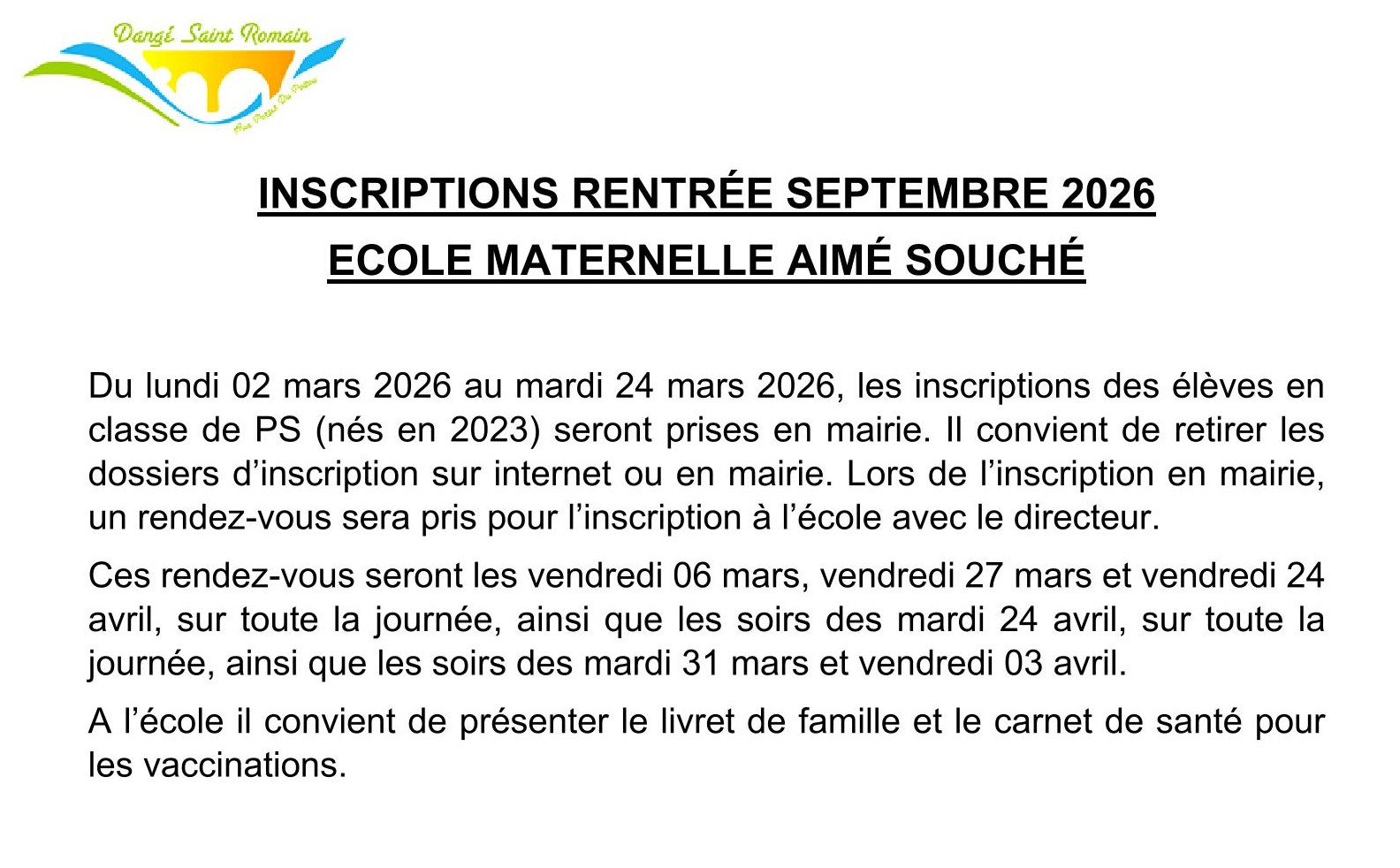 Inscriptions scolaires 2026 – 2027 école maternelle SOUCHE